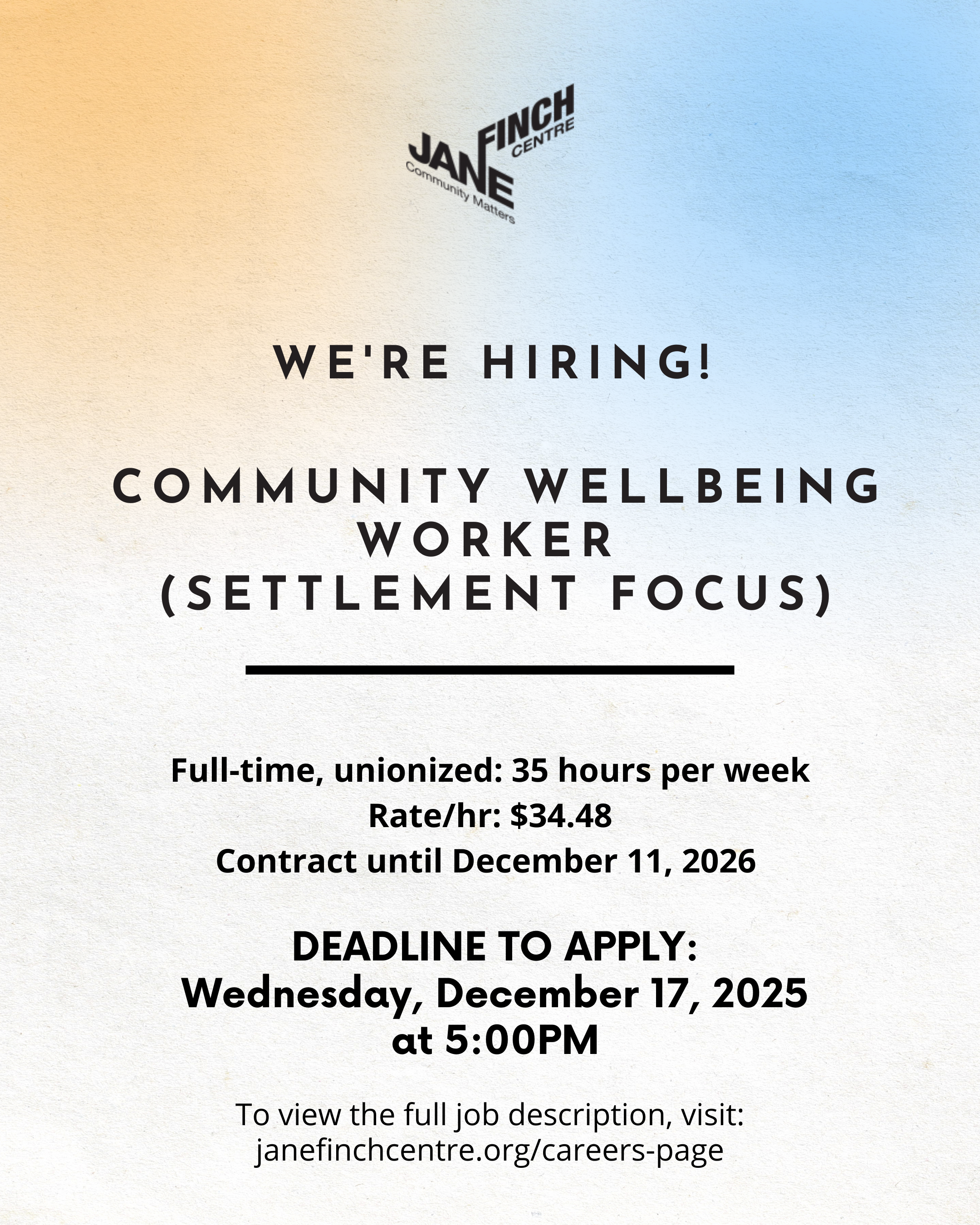 The Jane/Finch Centre is recruiting for a Community Well-Being Worker (Settlement Focus) to cover a maternity leave until December 11, 2026. This full-time, unionized position (35 hours per week) plays an important role in supporting newcomer residents through culturally responsive settlement, care navigation, and wellbeing-focused programming.