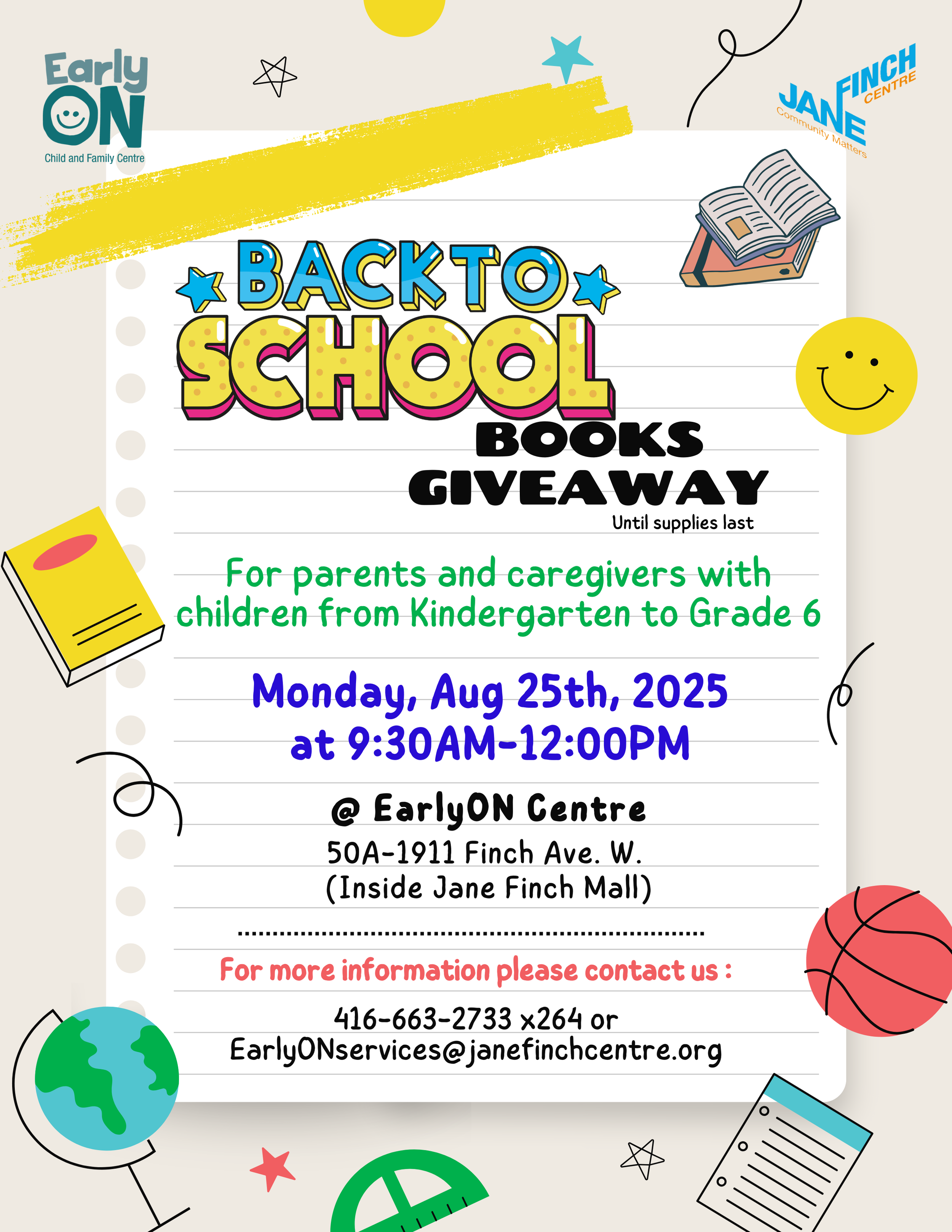 For more information, contact us: 416-663-2733 x 264 or EarlyONservices@janefinchcentre.org.