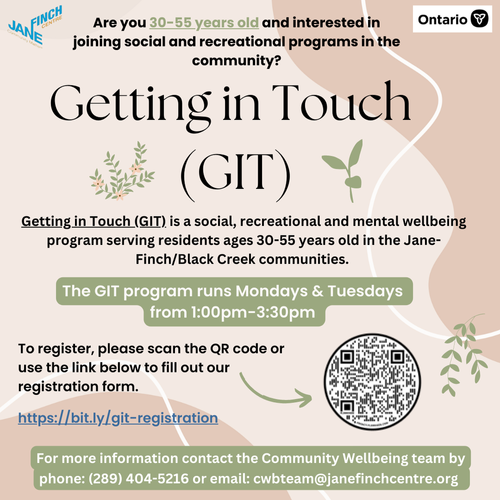 Are you 30-55 years old and interested in joining social and recreation programs in the community? Getting in Touch (GIT) is a social, recreational and mental wellbeing program serving residents ages 30-55 years old in the Jane-Finch/Black Creek communities.