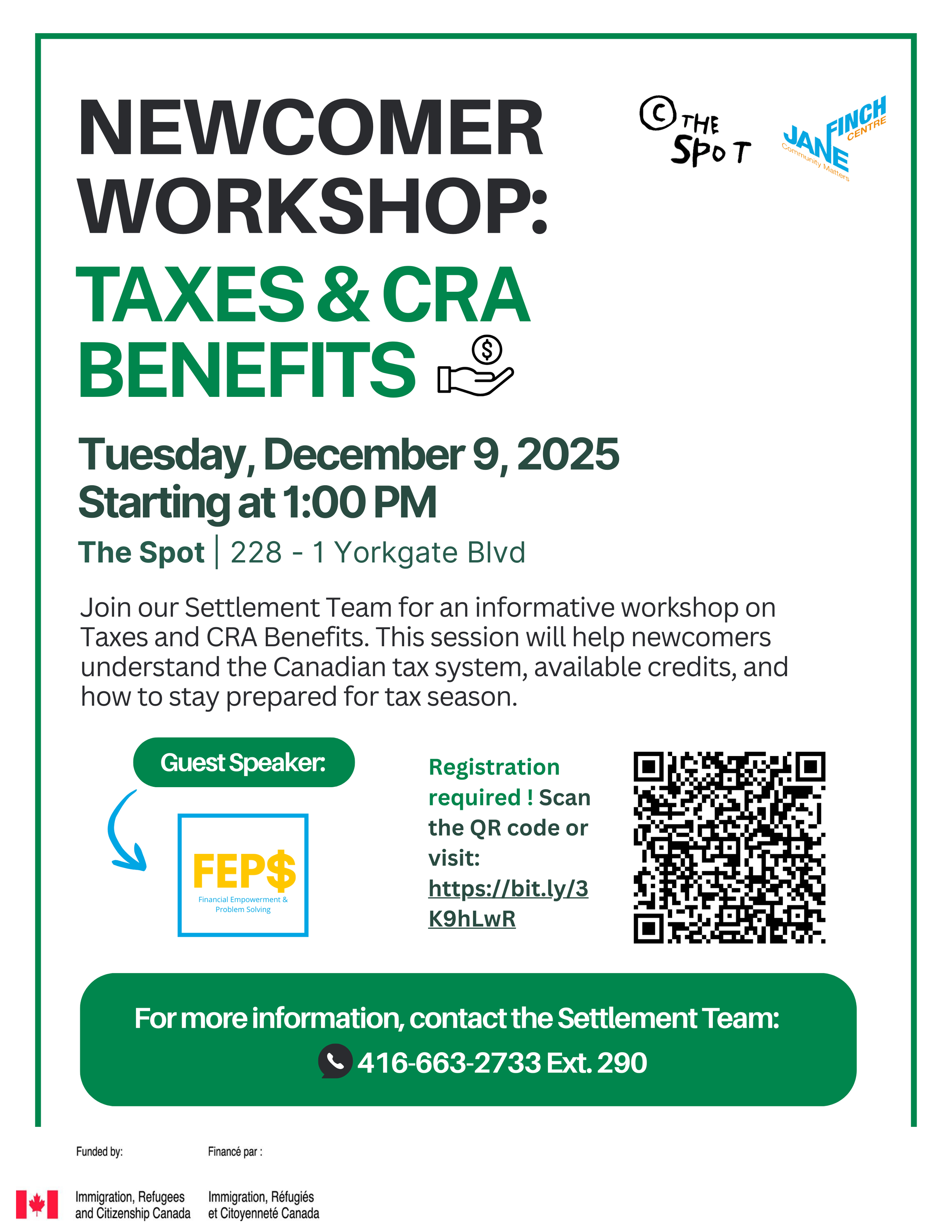 Our Settlement Team is hosting a workshop for newcomers to learn more about Taxes and CRA Benefits. With guest speakers from our Financial Empowerment & Problem Solving (FEPS) team. This session will help newcomers understand the Canadian tax system, available credits, and how to stay prepared for tax season.