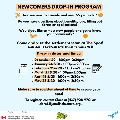 Are you new to Canada and over 55 years old? Do you have questions about benefits, jobs, filling out forms or applications? Come and visit the settlement team at The Spot! (Inside Yorkgate Mall)