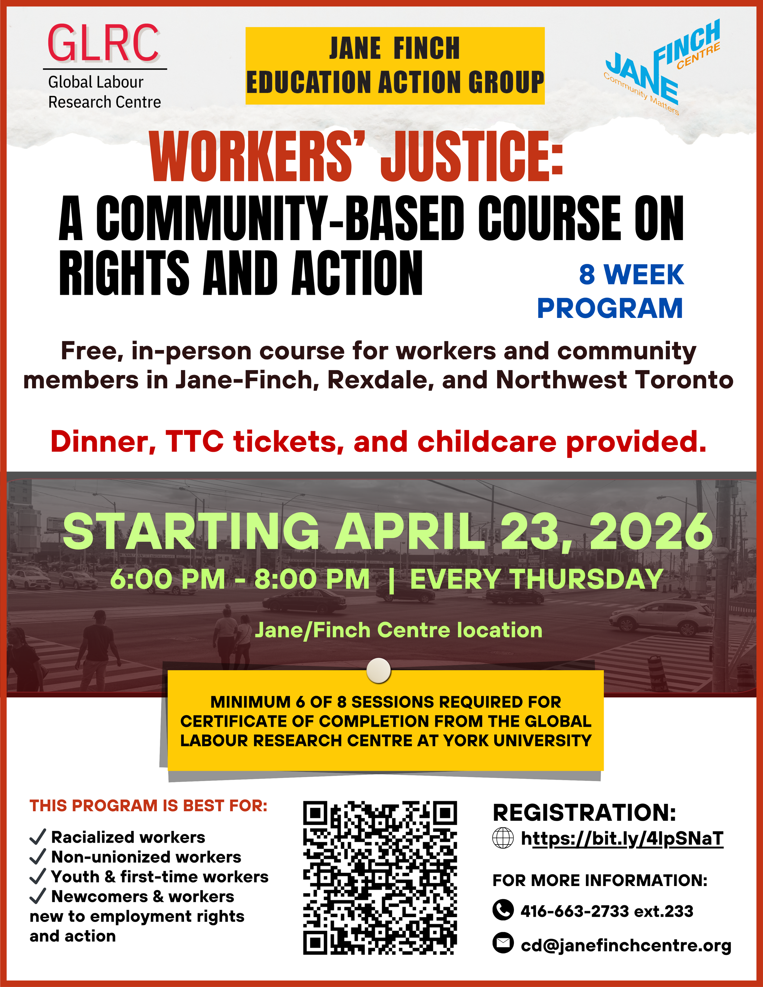 Are you a worker or resident in the Jane-Finch, Rexdale, or Northwest Toronto area? Join us for a free, introductory 8-week in-person course exploring workers' rights, workplace justice and collective action.